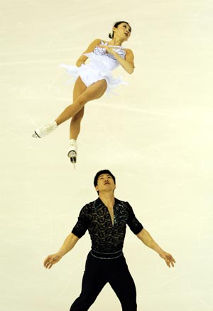(090221) — HARBIN, Feb. 21, 2009 (Xinhua) — China’s Zhang Dan (Top) and Zhang Hao perform during the pairs short program of figure skating at the 24th World Winter Universiade in the Harbin International Conference, Exhibition and Sports Center Gym in Harbin, capital of northeast China’s Heilongjiang Province, Feb. 21, 2009. Zhang Dan and Zhang Hao ranked the 1st with 68.32 points in the competition. (Xinhua/Li Yong) (kh)