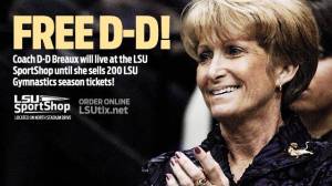 LSU gymnastics head coach D-D Breaux is going to live and spend the night inside a tent in the LSU SportShop beginning Thursday, and she will remain there until Dec. 21 unless she reaches her goal of selling 200 gymnastics season tickets.
