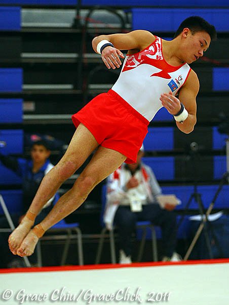 Super clean Sam Zakutney, of National Capital (Ottawa) dominates Argo field of 33 with 86.300 points AA after 1st day of competition, with most E-scores over 9.30 & top scores on vault, p-bars, & hi bar. Kieran Fagan of Capital City (Edmonton) is in 2nd with 83.550 points.