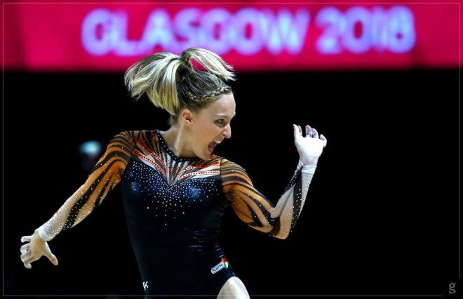 Celine finished 4th 4.600 + 8.700 = 13.300. Only two tumbling lines. The medalists had D-scores of 5.5, 5.5 and 5.3.