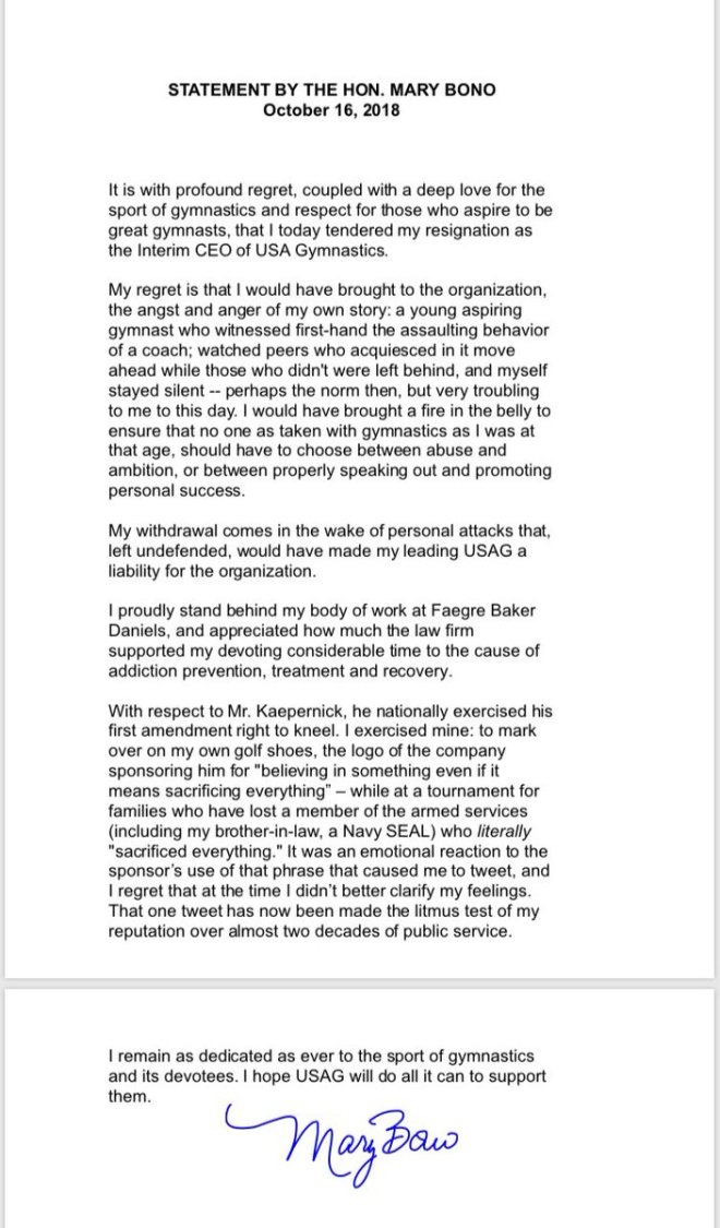 The USA Gymnastics Board of Directors accepted the resignation of Mary Bono as interim president and CEO. Despite her commitment to the sport of gymnastics and helping the organization move forward, we believe this is in the best interest of the organization. We, as a Board, are committed to taking action when we believe a change of course is necessary and to being responsive to our gymnastics community.