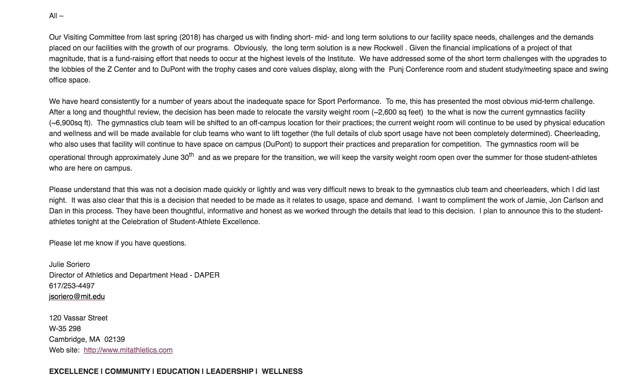We have an online spreadsheet summarizing arguments for keeping the Gym as it is now. For example, how varsity athletes in other sports could utilize our unique training facilities to improve performance and reduce injury.