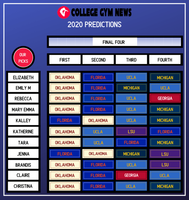 NCAA predictions 2020 The gang at College Gym News put together quite a few graphics. Here’s one. Check out the rest. Share this: Share on X (Opens in new window) X Share on Facebook (Opens in new window) Facebook Share on Tumblr (Opens in new window) Tumblr Email a link to a friend (Opens in new window) Email Print (Opens in new window) Print Like Loading... Published by Rick Mc Career gymnastics coach who loves the outdoors, and the internet. View all posts by Rick Mc