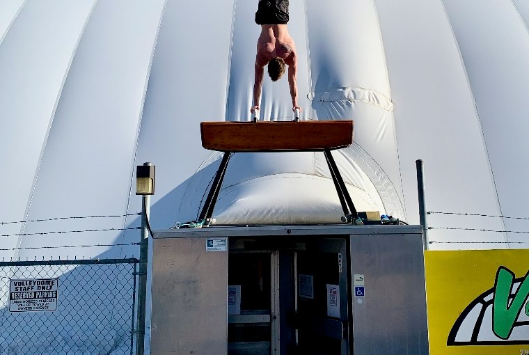 Former Canadian National Team Head Coach Tony Smith was installing an ancient Pommel Horse above the entrance. Mason climbed up for some photos.