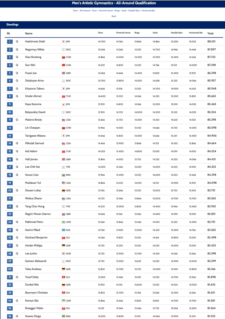 Men’s Olympic finalists – AA Click image for larger version. Full results. 19-year-old HASHIMOTO Daiki Share this: Click to share on X (Opens in new window) X Click to share on Facebook (Opens in new window) Facebook Click to share on Tumblr (Opens in new window) Tumblr Click to email a link to a friend (Opens in new window) Email Click to print (Opens in new window) Print Like Loading... Published by Rick Mc Career gymnastics coach who loves the outdoors, and the internet. View all posts by Rick Mc