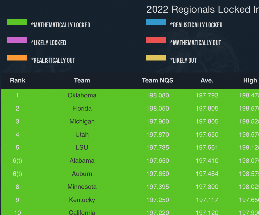 28 NCAA teams have LOCKED Regionals Check the chart on Road to Nationals. Share this: Share on X (Opens in new window) X Share on Facebook (Opens in new window) Facebook Share on Tumblr (Opens in new window) Tumblr Email a link to a friend (Opens in new window) Email Print (Opens in new window) Print Like Loading... Published by Rick Mc Career gymnastics coach who loves the outdoors, and the internet. View all posts by Rick Mc