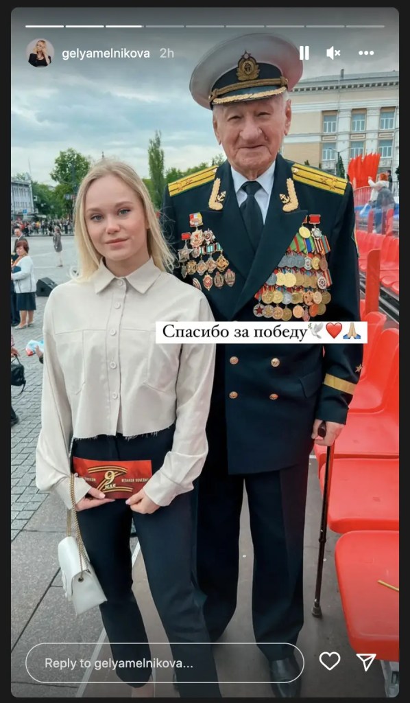 Angelina Melnikova took part in a military march, posing with a Russian army veteran, holding a cardboard box marked with the letter Z, the militaristic symbol associated with supporters of the invasion of Ukraine.