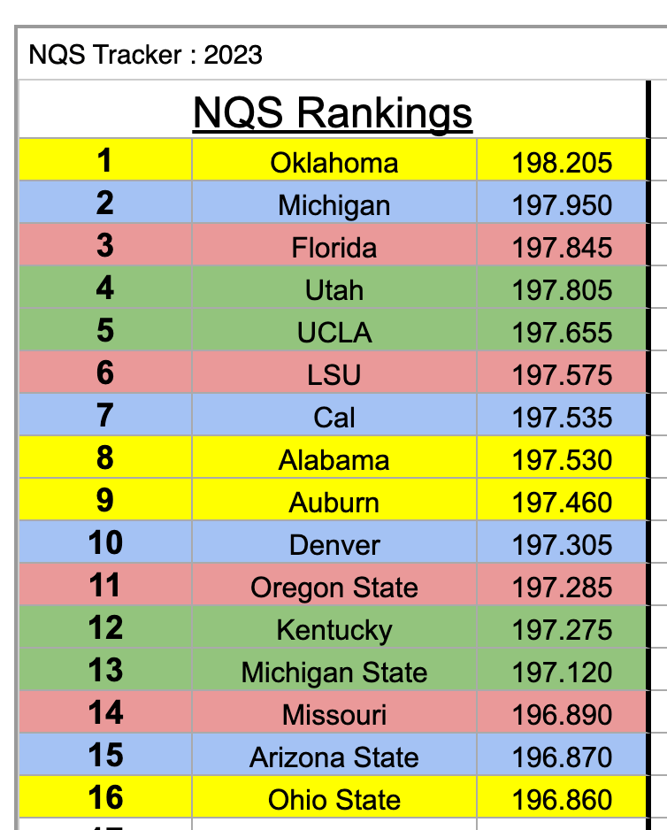 NQS Feb 28, 2023 IF the season ended today. Share this: Share on X (Opens in new window) X Share on Facebook (Opens in new window) Facebook Share on Tumblr (Opens in new window) Tumblr Email a link to a friend (Opens in new window) Email Print (Opens in new window) Print Like Loading... Published by Rick Mc Career gymnastics coach who loves the outdoors, and the internet. View all posts by Rick Mc