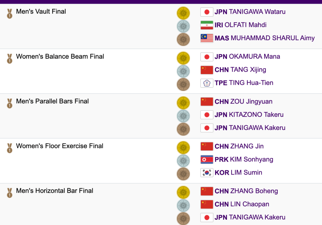 Asian Games Finals – day 2 Full scores. ZOU Jungyuan went 15.933 on P Bars ! Share this: Share on X (Opens in new window) X Share on Facebook (Opens in new window) Facebook Share on Tumblr (Opens in new window) Tumblr Email a link to a friend (Opens in new window) Email Print (Opens in new window) Print Like Loading... Published by Rick Mc Career gymnastics coach who loves the outdoors, and the internet. View all posts by Rick Mc