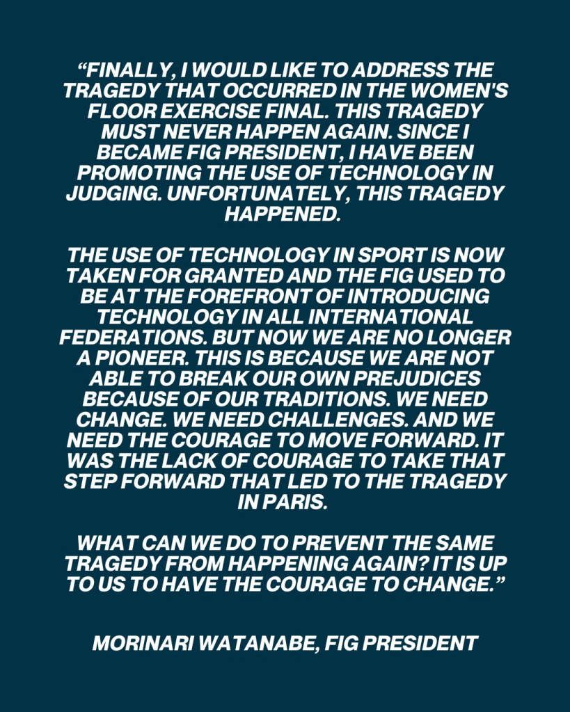 FIG President Morinari Watanabe addressed the women’s floor Olympic bronze medal debacle in the latest FIG Bulletin.#Paris2024 #Olympics pic.twitter.com/sFHhBZ2mti
