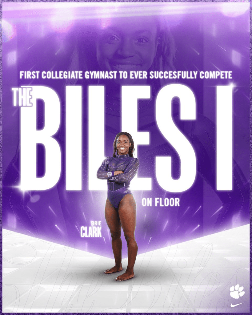 HISTORY for Clemson's Brie Clark, who just became the first college gymnast to successfully compete the Biles I (double layout half) on floor! (🎥: Clemson Gymnastics)#NCAAgym