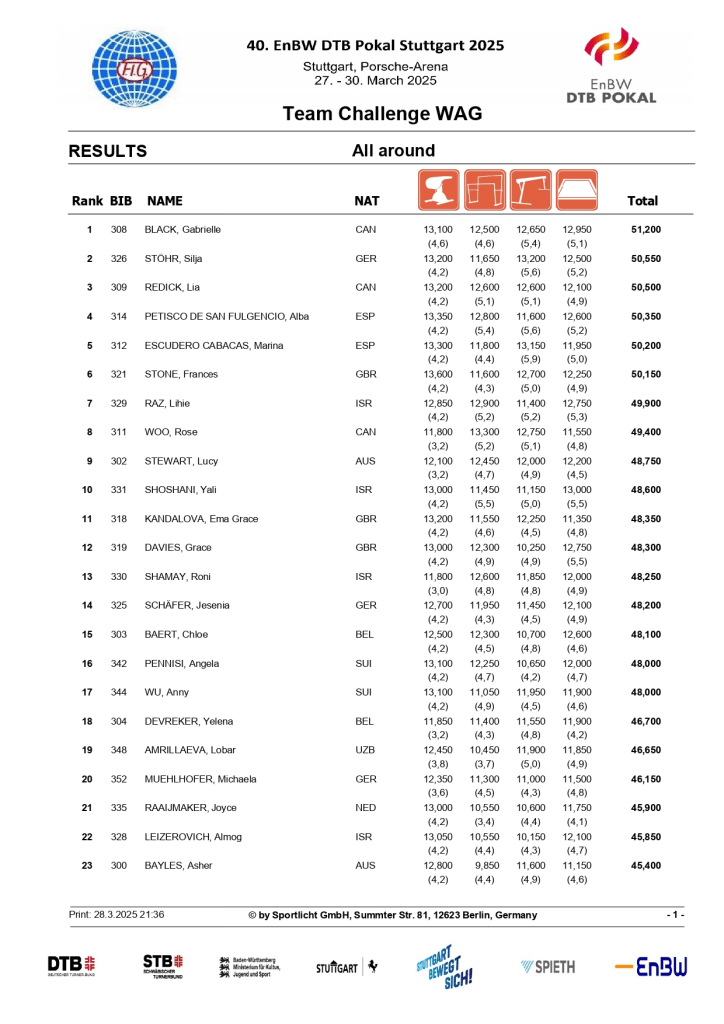 DTB Pokal 2025 AA results BLACK, Gabby 51,200 CANADA STÖHR, Silja 50,550 GERMANY REDICK, Lia 50,500 CANADA Share this: Click to share on X (Opens in new window) X Click to share on Facebook (Opens in new window) Facebook Click to share on Tumblr (Opens in new window) Tumblr Click to email a link to a friend (Opens in new window) Email Click to print (Opens in new window) Print Like Loading... Published by Rick Mc Career gymnastics coach who loves the outdoors, and the internet. View all posts by Rick Mc