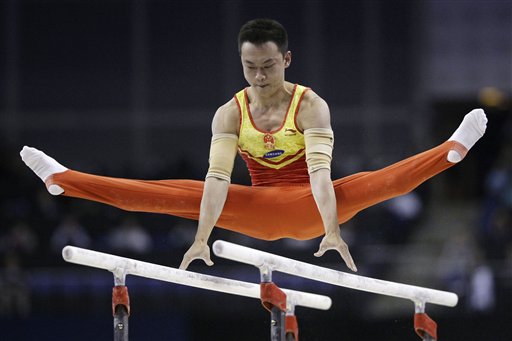 Wang Guanyin of China in action in the men’s parallel bars final, during the World Gymnastics Championships at the O2 Arena in London, Sunday, Oct. 18, 2009. (AP Photo/Matt Dunham)