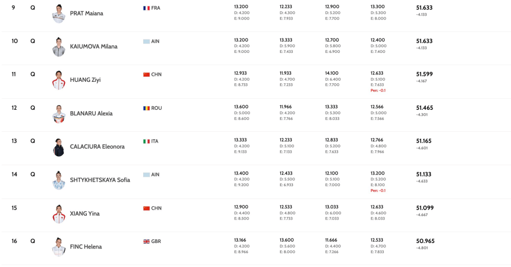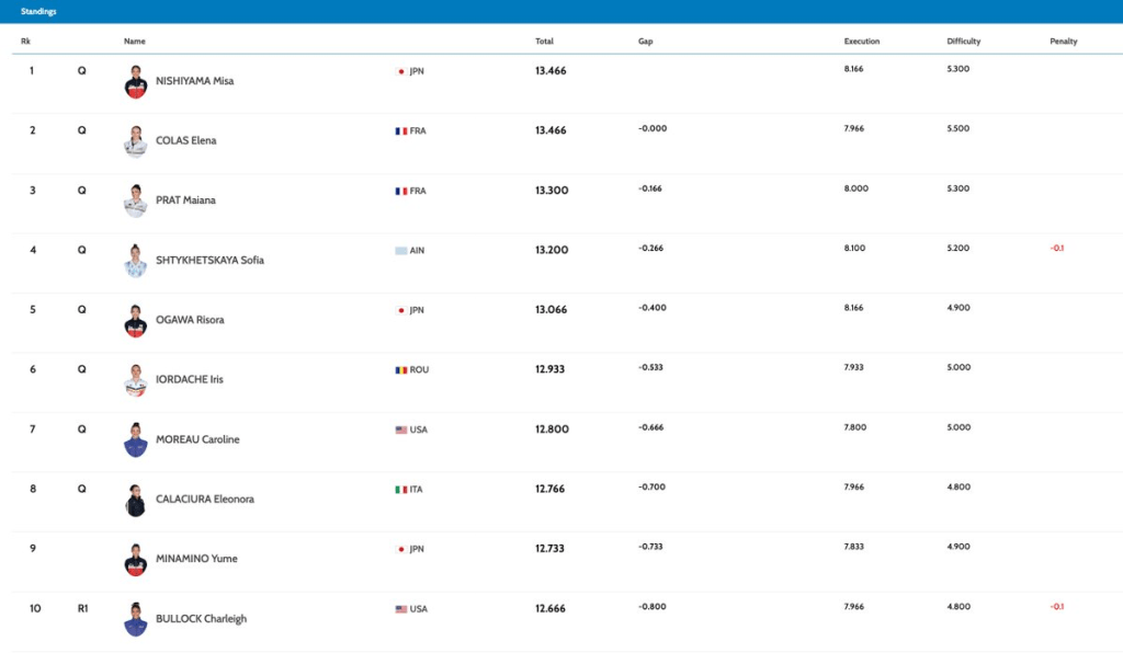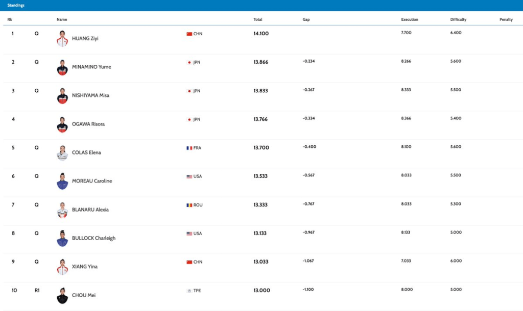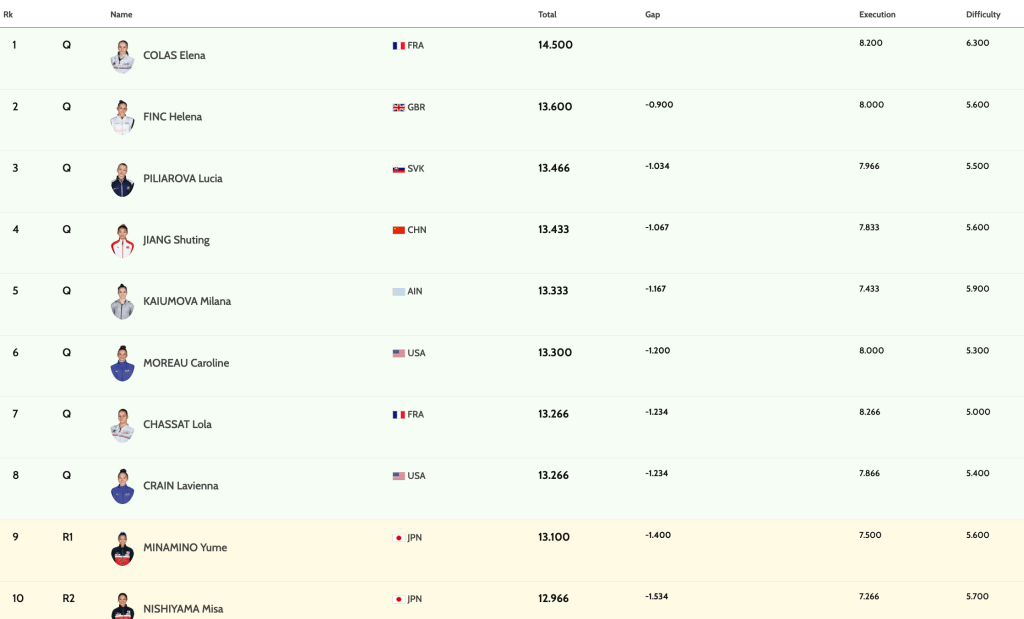 Manamino Yume had a terrific meeting to improve her qualifications score by 0.30 to total 53.632. Silver Elena Colas of France (53.298). Bronze Nishiyama Misa of Japan (53.066).