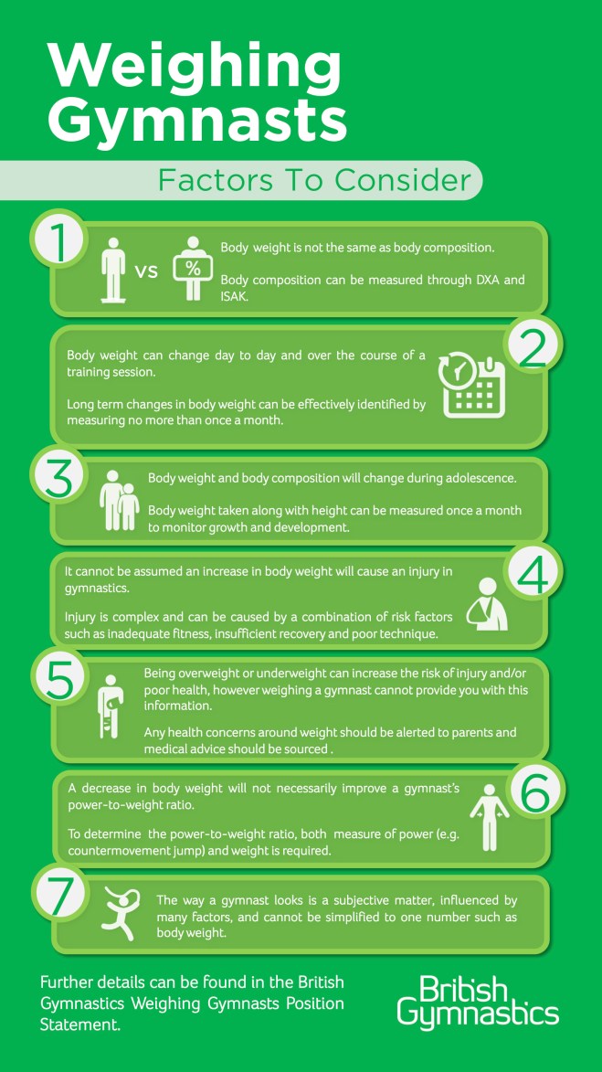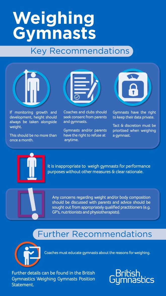 Created as a guidance document for clubs, coaches, parents and gymnasts the statement gives advice and reasoning on the complexities surrounding weighing gymnasts with the gymnasts optimal long-term development at its core.