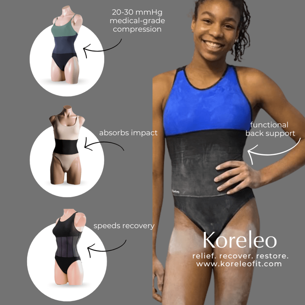Through the strategic integration of 20-30 mmHg medical-grade compression into the core of all Koreleo apparel, gymnasts can now access quantifiable relief from lumbar inflammation and safeguard themselves against overuse and repetitive injuries. This proprietary compression technology is sourced from a reputable USA textile mill renowned for its expertise in medical applications. Rigorously tested, scientifically proven, and patented, Koreleo’s cutting-edge collection transcends traditional leotards and singlets, ushering in a transformative training and recovery experience with its hallmark features: