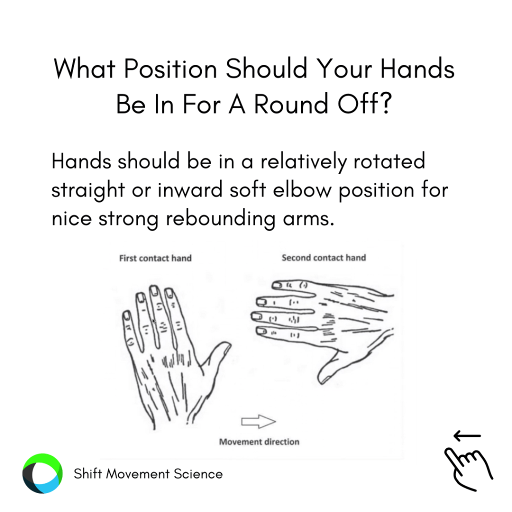 A study from 2015 — “Elbow joint variability for different hand positions of the round off in gymnastics” — concluded that what I’ve heard called the classic T position is best and safest for the elbows when doing Round-offs.