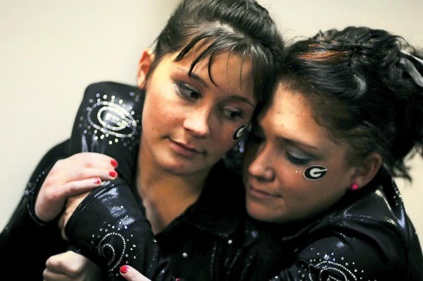 Kelly Lambert/StaffGeorgia’s Grace Taylor, left, and Courtney McCool hug outside of their lockerroom after finishing second in the SEC Championship behind Alabama Saturday, March 21, 2009, at the Sommet Center in Nashville, TN.