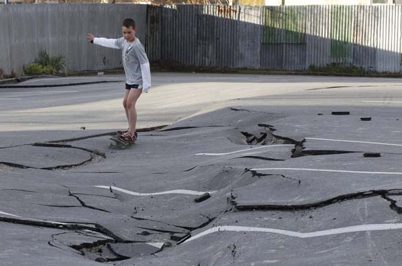 A young boy takes advantage of warped road to skateboard on in Paiapoi, 20km south of Christchurch, New Zealand, Sunday, Sept. 5, 2010. Christchurch was struck by a powerful 7.1-magnitude earthquake on Saturday Sept. 4, 2010 that smashed buildings, cracked roads and twisted rail lines and also ripped a new 11-foot (3.5 meter) wide fault line in the earth’s surface, officials said Sunday. (AP Photo/Rob Griffith)