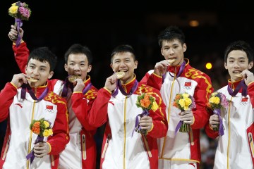 (From L) China’s gymnasts China’s Feng Zhe, Guo Weiyang, Chen Yibing, Zhang Chenglong and Zou Kai pose with their gold medals on the podium during the medal ceremony of the men’s team of the artistic gymnastics event at the London Olympic Games on July 30, 2012 at the 02 North Greenwich Arena in London. Japan took the silver medal in the men’s artistic gymnastics team final on Monday after a judges’ inquiry that dropped hosts Great Britain from second to third and denied Ukraine a medal. AFP PHOTO / THOMAS COEXTHOMAS COEX/AFP/GettyImages
