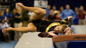 Mary Atkinson of Arizona State hits the vault during her exercise in the individual event finals during the NCAA gymnastics championships in Gainesville, Fla., Saturday, April 24, 2010. (AP / Phil Sandlin)