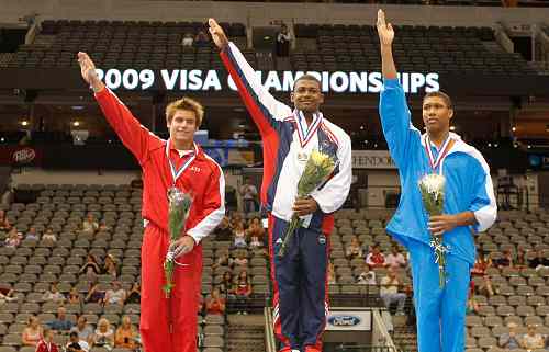 John Orozco (center) won his third consecutive U.S. junior title in Dallas. Sam Mikulak (left) finished second ahead of bronze medalist Christopher Turner.