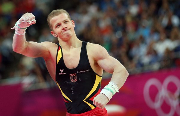 German gymnast Fabian Hambuechen celebrates after performing on the horizontal bar during men’s team final in North Greenwich Arena at the London 2012 Olympic Games, London, Great Britain, 30 July 2012. Photo: Friso Gentsch dpa. Photo: Friso Gentsch dpa
