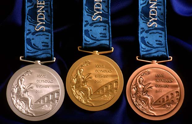 The gold, silver and bronze medals to be awarded at the Sydney 2000 Olympic Games are pictured in this handout photograph from August 13, 2000. Games organisers were having to explain a mistake that has upset the local Greek community in the design of the Sydney 2000 gold, silver and bronze medals which picture the colosseum in Rome rather than the Parthenon in Athens. The Sydney Organising Committee for the Olympic Games (SOCOG) say the design is a generic Colosseum and not the famous Roman one. REUTERS/HO [PNG Merlin Archive]