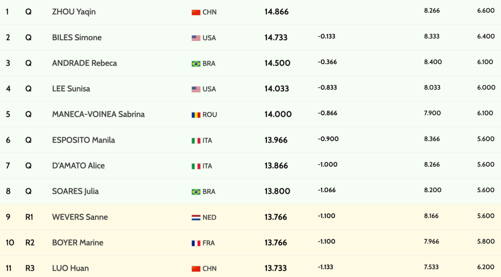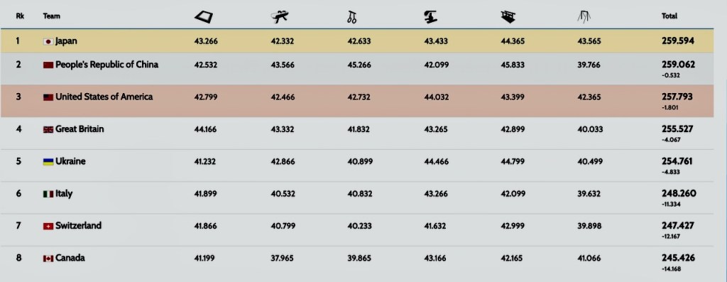 … gold was China’s to lose heading into the final rotation. Stellar routines from superstars like Liu Yang on Still Rings, Zou Jingyuan on Parallel Bars, and All-Around excellence from Zhang Boheng put them in a great position. Heading into the sixth and final rotation, China was still 3.2 points ahead.