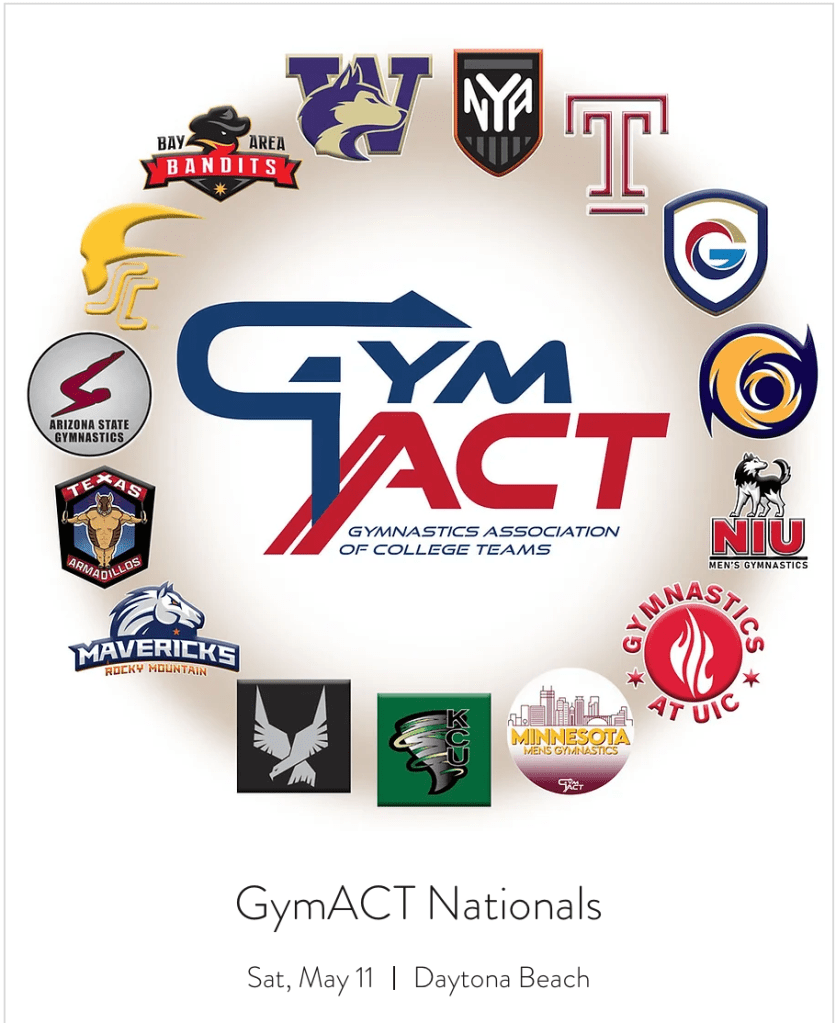 GymACT (Gymnastics Association of College Teams) is organized to help create, grow and maintain collegiate Men’s gymnastics. Teams are unaffiliated with the NCAA and not funded by schools, yet striving to compete at the same level.