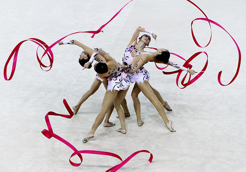 Singapore rhythmic gymnastics team perform the group all-around qualifications 4 ribbons on day 10 of the Singapore 2010 Youth Olympic Games (YOG) held at the Bishan Stadium, Aug 24, 2010. They earned a score of 19.550, ranking 4th in that round. Photo: SPH-SYOGOC/Nuria Ling