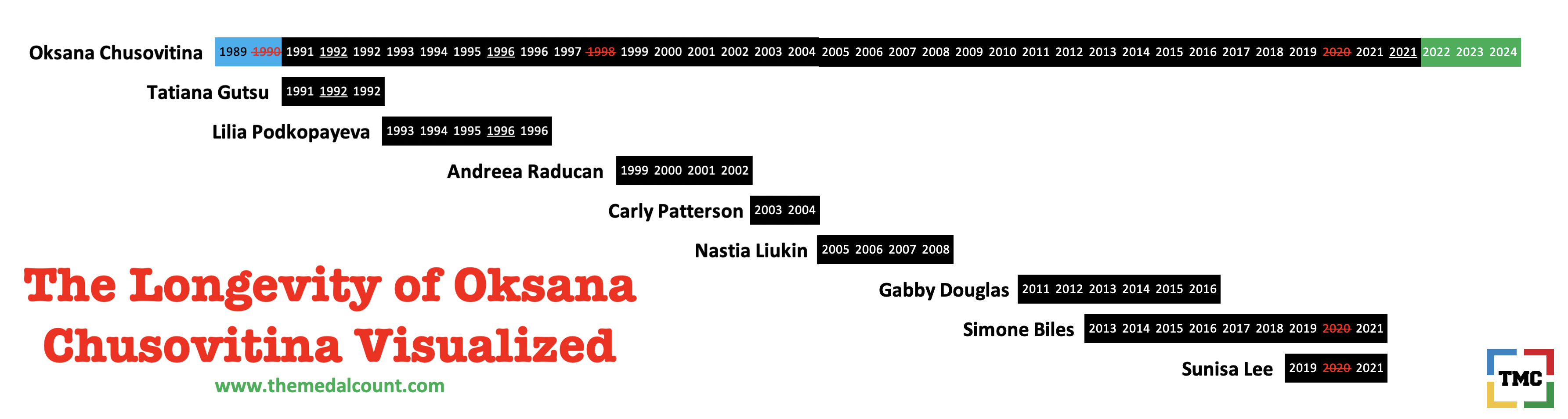 Previous ImageNext Image the-longevity-of-oksana-chusovitina-visualized Share this: Share on X (Opens in new window) X Share on Facebook (Opens in new window) Facebook Share on Tumblr (Opens in new window) Tumblr Email a link to a friend (Opens in new window) Email Print (Opens in new window) Print Like Loading...