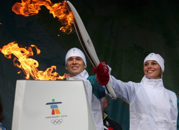 VICTORIA, B.C.: OCTOBER 30, 2009 Left Olympic triathalete gold medalist Simon Whitfield and speed skating gold medalist Catriona Le May Doan light the Olympic torches as the first people to carry the Olympic torch from the Legislature as part of the Olympic torch relay which started on the grounds of the legislature in Victoria, B.C. October 30, 2009. (DEBRA BRASH, TIMES COLONIST). For City story by Lindsay Kines