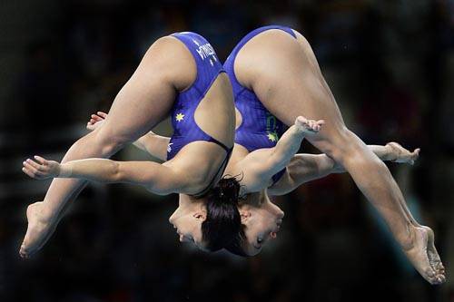 ATHENS – AUGUST 16: Lynda Folauhola and Loudy Tourky of Australia compete in the women’s synchronised diving 10 metre platform event on August 16, 2004 during the Athens 2004 Summer Olympic Games at the Aquatic Centre Indoor Pool at the Olympic Sports Complex in Athens, Greece. (Photo by Clive Mason/Getty Images) *** Local Caption *** Lynda Folauhola;Loudy Tourky